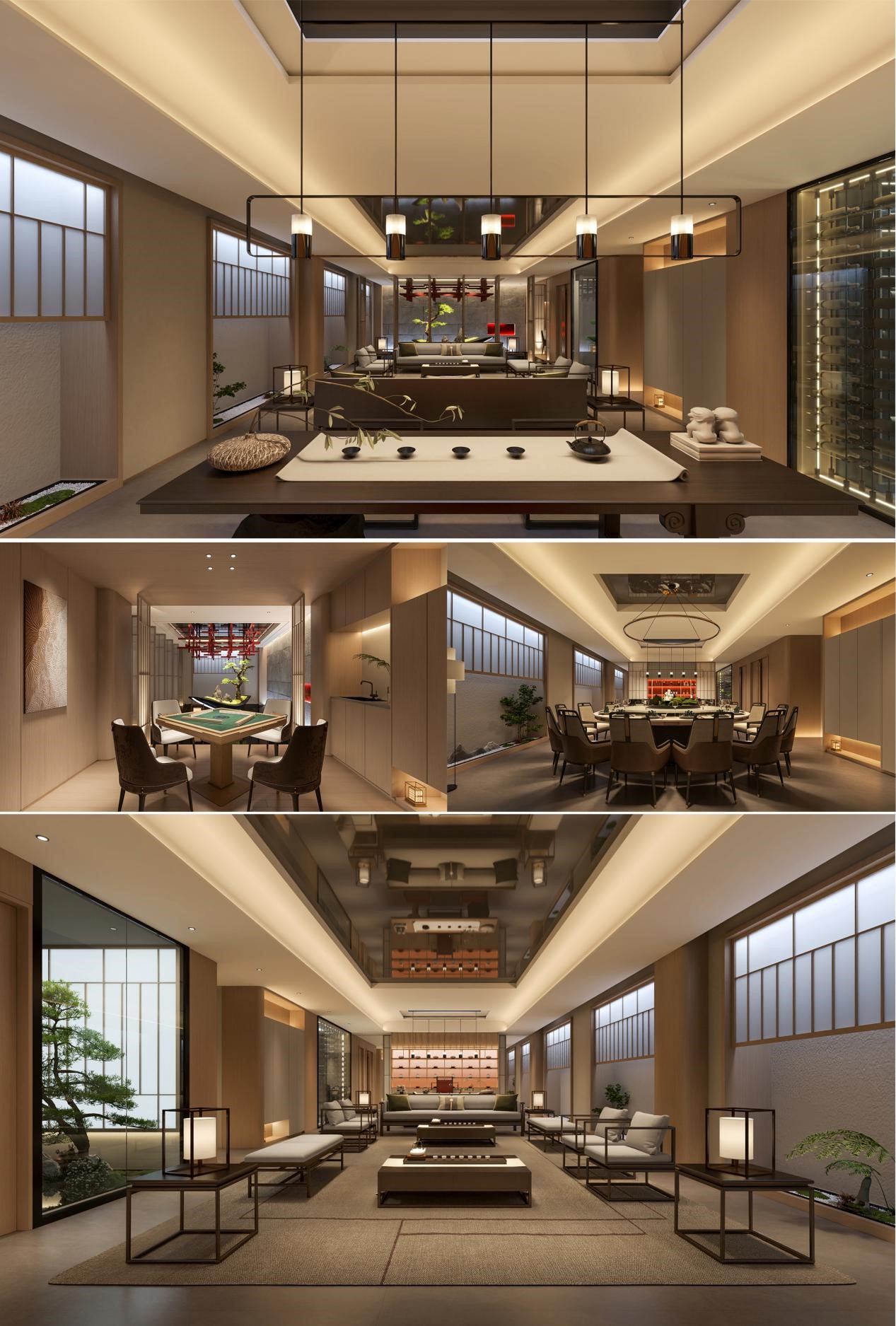 茶室和会客区面对面,既在一个大空间里,又保持合适的距离,聊天时不会互相打扰。两侧中式屏风或玻璃隔挡,格挡外的造景与光互动,喝茶的人和景致都融在一起,特别自在。